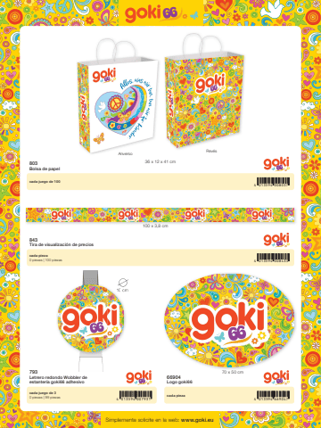 234 013594 007931 4 013594 6690474 013594 0080374 013594 00843336 x 12 x 41 cm100 x 3,8 cm10 cm70 x 50 cmSimplemente solicite en la web: www.goki.eu793Letrero redondo Wobbler de estanter%u00eda goki66 adhesivo66904Logo goki66cada juego de 30 piezas | 99 piezas cada pieza803Bolsa de papel843Tira de visualizaci%u00f3n de precioscada juego de 100cada pieza0 piezas | 100 piezasAnversoRev%u00e9s