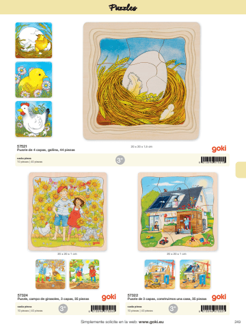 2493+ 3+4 013594 573245 4 013594 5732213 4 013594 575218+20 x 20 x 1 cm 20 x 20 x 1 cm20 x 20 x 1,5 cmSimplemente solicite en la web: www.goki.euPuzzles57324Puzzle, campo de girasoles, 3 capas, 35 piezas57322Puzzle de 3 capas, construimos una casa, 35 piezascada pieza10 piezas | 40 piezascada pieza10 piezas | 40 piezas57521Puzzle de 4 capas, gallina, 44 piezascada pieza10 piezas | 40 piezas