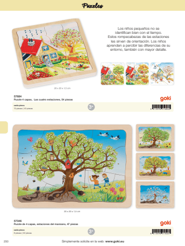 2504 013594 5768404 013594 5734673+3+20 x 20 x 1,5 cm20 x 20 x 1,5 cmSimplemente solicite en la web: www.goki.euPuzzlesLos ni%u00f1os peque%u00f1os no se identifi can bien con el tiempo.Estos rompecabezas de las estaciones les sirven de orientaci%u00f3n. Los ni%u00f1os aprenden a percibir las diferencias de su entorno, tambi%u00e9n con mayor detalle.57684Puzzle 4 capas, Las cuatro estaciones, 54 piezas57346Puzzle de 4 capas, estaciones del manzano, 47 piezascada pieza10 piezas | 40 piezascada pieza8 piezas | 32 piezas