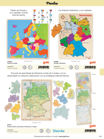 2655 4 013594 574174+ 985+ 4+4 013594 575096 4 013594 57860835 1630 x 40 x 1 cm32 x 30 x 1 cm 30 x 40 x 1 cmSimplemente solicite en la web: www.goki.euPuzzles57417Puzzle dentro del puzzle, Alemania, 3 capascada pieza12 piezas | 24 piezas57509Puzzle, Europa57860Encaje, Alemaniacada pieza0 piezas | 18 piezascada pieza12 piezas | 24 piezasEl puzzle de aprendizaje de Alemania consta de 3 niveles y se ha desarrollado en estrecha colaboraci%u00f3n con la prestigiosa editorial Diercke. 1%u00aa capa2%u00aa capa3%u00aa capaPa%u00edses de Europa y Los Estados federados y sus capitales.sus capitales. Incluye leyenda aparte.