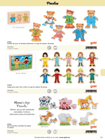 2754 013594 5781104 013594 5747544 013594 5741432+3+2+27 x 13,5 x 3,5 cm13 x 21 x 4,2 cm22,5 x 23 cmSimplemente solicite en la web: www.goki.euPuzzles57811Familia de osos, 12 vestidos diferentes, en caja de madera, 36 piezas57475Juego para vestir ni%u00f1o y ni%u00f1a, en caja de madera, 36 piezas 57414Set de puzzles, animales de granja, 27 piezascada pieza12 piezas | 24 piezascada pieza12 piezas | 24 piezascada juego0 juegos | 20 juegosMam%u00e1 e hijoPuzzle. Tablero de puzzle resistente, adorables motivos, adecuado para principiantes