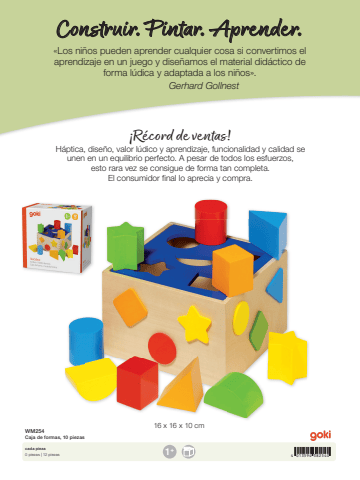 4 013594 38254016 x 16 x 10 cm1+WM254Caja de formas, 10 piezascada pieza0 piezas | 12 piezas%u00abLos ni%u00f1os pueden aprender cualquier cosa si convertimos el aprendizaje en un juego y dise%u00f1amos el material did%u00e1ctico de forma l%u00fadica y adaptada a los ni%u00f1os%u00bb. Gerhard GollnestConstruir. Pintar. Aprender.%u00a1R%u00e9cord de ventas!H%u00e1ptica, dise%u00f1o, valor l%u00fadico y aprendizaje, funcionalidad y calidad se unen en un equilibrio perfecto. A pesar de todos los esfuerzos, esto rara vez se consigue de forma tan completa. El consumidor final lo aprecia y compra.