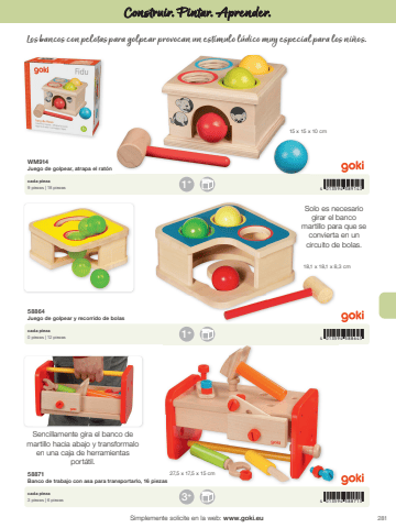 2814 013594 5887134 013594 5886454 013594 3891433+1+1+18,1 x 18,1 x 8,3 cm15 x 15 x 10 cm27,5 x 17,5 x 15 cmSimplemente solicite en la web: www.goki.euConstruir. Pintar. Aprender.58871Banco de trabajo con asa para transportarlo, 16 piezas58864Juego de golpear y recorrido de bolasWM914Juego de golpear, atrapa el rat%u00f3ncada pieza3 piezas | 6 piezascada pieza0 piezas | 12 piezascada pieza9 piezas | 18 piezasLos bancos con pelotas para golpear provocan un est%u00edmulo l%u00fadico muy especial para los ni%u00f1os.Solo es necesario girar el banco martillo para que se convierta en un circuito de bolas.Sencillamente gira el banco de martillo hacia abajo y transformalo en una caja de herramientas port%u00e1til.