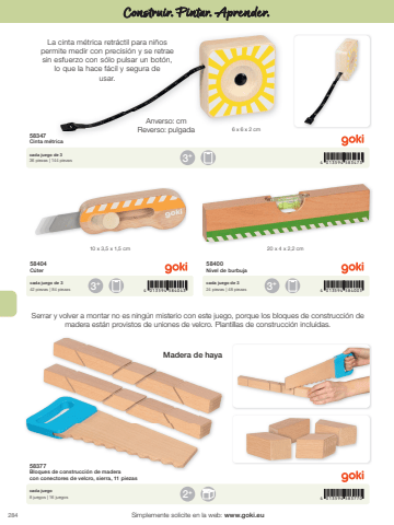 2843 4 013594 583473+3+ 3+4 013594 584043 4 013594 5840052 4 013594 583770+6 x 6 x 2 cm10 x 3,5 x 1,5 cm 20 x 4 x 2,2 cmSimplemente solicite en la web: www.goki.euConstruir. Pintar. Aprender.58347Cinta m%u00e9tricacada juego de 336 piezas | 144 piezas58404C%u00fater58400Nivel de burbujacada juego de 342 piezas | 84 piezascada juego de 324 piezas | 48 piezas58377Bloques de construcci%u00f3n de madera con conectores de velcro, sierra, 11 piezascada juego8 juegos | 16 juegosSerrar y volver a montar no es ning%u00fan misterio con este juego, porque los bloques de construcci%u00f3n de madera est%u00e1n provistos de uniones de velcro. Plantillas de construcci%u00f3n incluidas.Madera de hayaAnverso: cmReverso: pulgadaLa cinta m%u00e9trica retr%u00e1ctil para ni%u00f1os permite medir con precisi%u00f3n y se retrae sin esfuerzo con s%u00f3lo pulsar un bot%u00f3n, lo que la hace f%u00e1cil y segura de usar.