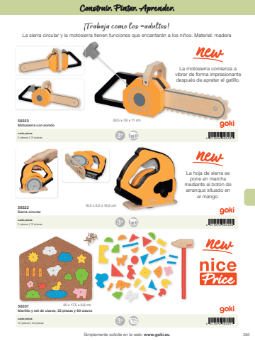 2854 013594 5832374 013594 5832204 013594 5830773+3+3+33,5 x 7,6 x 11 cm15,5 x 5,5 x 15,5 cm20 x 17,5 x 0,8 cmSimplemente solicite en la web: www.goki.euConstruir. Pintar. Aprender.58323Motosierra con sonido58322Sierra circular58307Martillo y set de clavos, 52 piezas y 60 clavoscada pieza0 piezas | 15 piezascada pieza0 piezas | 12 piezascada pieza12 piezas | 24 piezas%u00a1Trabaja como los %u00abadultos!La sierra circular y la motosierra tienen funciones que encantar%u00e1n a los ni%u00f1os. Material: madera La motosierra comienza a vibrar de forma impresionante despu%u00e9s de apretar el gatillo.La hoja de sierra se pone en marcha mediante el bot%u00f3n de arranque situado en el mango.