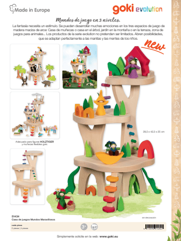 27evolution3 4 013594 514347+28,5 x 42,3 x 25 cmSimplemente solicite en la web: www.goki.eu51434Casa de juegos Mundos Maravillososcada pieza0 piezas | 4 piezasMundos de juego en 3 niveles. La fantas%u00eda necesita un est%u00edmulo. Se pueden desarrollar muchas emociones en los tres espacios de juego de madera maciza de arce: Casa de mu%u00f1ecas o casa en el %u00e1rbol, jard%u00edn en la monta%u00f1a o en la terraza, zona de juegos para animales... Los productos de la serie evolution no pretenden ser limitados. Abren posibilidades, que se adaptan perfectamente a las manitas y las mentes de los ni%u00f1os.Adecuado para fi guras HOLZTIGERy mu%u00f1ecas fl exibles goki.sin decoraci%u00f3n
