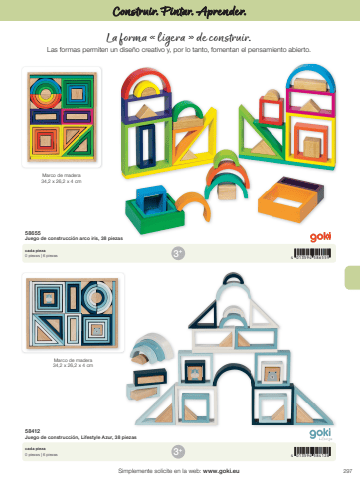2974 013594 5865594 013594 5841283+3+Simplemente solicite en la web: www.goki.euConstruir. Pintar. Aprender.58655Juego de construcci%u00f3n arco iris, 38 piezas58412Juego de construcci%u00f3n, Lifestyle Azur, 38 piezascada pieza0 piezas | 6 piezascada pieza0 piezas | 6 piezasMarco de madera34,2 x 26,2 x 4 cmMarco de madera34,2 x 26,2 x 4 cmLa forma %u00ab ligera %u00bb de construir.Las formas permiten un dise%u00f1o creativo y, por lo tanto, fomentan el pensamiento abierto.