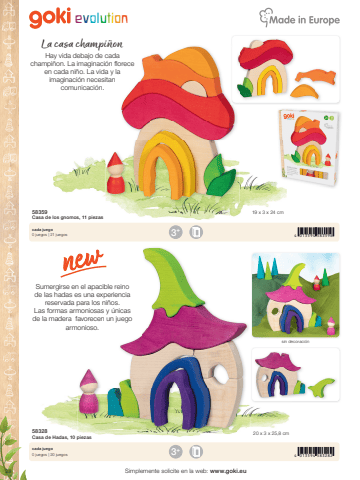 28evolution4 013594 5835964 013594 58328219 x 3 x 24 cm20 x 3 x 25,8 cm3+3+Simplemente solicite en la web: www.goki.eu58359Casa de los gnomos, 11 piezas58328Casa de Hadas, 10 piezascada juego0 juegos | 21 juegoscada juego0 juegos | 20 juegosSumergirse en el apacible reino de las hadas es una experiencia reservada para los ni%u00f1os.Las formas armoniosas y %u00fanicas de la madera favorecen un juego armonioso.La casa champi%u00f1onHay vida debajo de cada champi%u00f1on. La imaginaci%u00f3n fl orece en cada ni%u00f1o. La vida y la imaginaci%u00f3n necesitan comunicaci%u00f3n.sin decoraci%u00f3n