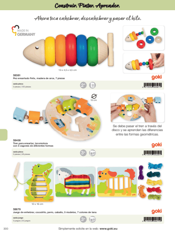 3004 013594 5867954 013594 5840814 013594 5838173+3+2+13 x 4,5 x 4,5 cm12 x 16 cm13 cmSimplemente solicite en la web: www.goki.euConstruir. Pintar. Aprender.58679Juego de enhebrar, cocodrilo, perro, caballo, 3 modelos, 7 colores de lana58408Tren para ensartar, locomotora con 5 vagones de diferentes formas58381Pez ensartado Felix, madera de arce, 7 piezascada juego0 juegos | 24 juegoscada pieza0 piezas | 48 piezascada pieza0 piezas | 120 piezasAhora toca enhebrar, desenhebrar y pasar el hilo.Se debe pasar el tren a trav%u00e9s del disco y se aprenden las diferencias entre las formas geom%u00e9tricas.