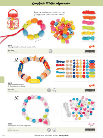 3024 013594 5849824 013594 6078414 013594 5867713+4+3+%u00ef 2 cm %u00f02,5 cm0,8 cmSimplemente solicite en la web: www.goki.euConstruir. Pintar. Aprender.58498Set de perlas, 5 modelos, 45 perlas, 6 hilos60784Collar perlas de madera, 46 piezas58677Juego de hilos multicolor, 48 elementos para enhebrarcada juego12 juegos | 24 juegoscada pieza48 piezas | 384 piezascada juego36 juegos | 72 juegosAprende a enhebrar con 6 cordones y 45 grandes elementos de madera.