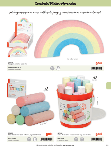 3113+ 3+4 013594 304061 4 013594 3040163+4 013594 583251%u00ef 11 cm %u00f02,5 cm%u00ef 11 cm %u00f02,5 cm11,5 x 6 x 1,3 cmSimplemente solicite en la web: www.goki.euConstruir. Pintar. Aprender.SP406Tizas de colores para exterior, caja con 6 tizasSP401Tizas de colores para exterior, caja con 15 tizasper 12 cajitas0 cajitas | 48 cajitascada cajita0 cajitas | 24 cajitas58325Tiza para exterior arco-%u00edriscada muestrario de 10120 piezas | 240 piezas%u00a1Abogamos por aceras, calles de juego y caminos de acceso de colores!