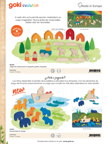 30evolution3,3 x 1,5 x 4,5 cm4 013594 5836574 013594 5145453+3+Simplemente solicite en la web: www.goki.eu58365Juego de construcci%u00f3n mi peque%u00f1o pueblo, 25 piezas51454Arca de No%u00e9, 21 piezascada juego0 juegos | 39 juegoscada juego0 juegos | 18 juegosA cada ni%u00f1o se le permite aportar creatividad a su juego imaginativo. Nunca antes las cosas bellas hab%u00edan sido tan favorables.%u00bfArte o juguete?Los ni%u00f1os desarrollan el sentido de la est%u00e9tica a una edad muy temprana. Con los elementos de juego del Arca les proporcionamos un juego que cumple los m%u00e1s altos est%u00e1ndares en este sentido.sin decoraci%u00f3nsin decoraci%u00f3n