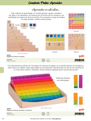 3184 013594 5862694 013594 5853544+4+24 x 1,2 x 2,3 cm27,5 x 27,5 x 11 cm9 - 3 = 6=6 + 3 + 1 = 10=Simplemente solicite en la web: www.goki.euConstruir. Pintar. Aprender.58626Regletas de c%u00e1lculo, barnizado, 100 piezas58535Regletas de c%u00e1lculo, 36 piezascada pieza1 pieza | 3 piezascada pieza0 piezas | 16 piezasAprender a calcular...Este m%u00e9todo de aprendizaje, en sentido general, ayuda a visualizar las cifras y los resultados, de manera que el mundo de los n%u00fameros y las cantidades se revela casi de forma l%u00fadica. Por supuesto, la caja de madera de haya tambi%u00e9n contiene instrucciones.AnversoAnversoEjemplo ReversoReversoCon esta ayuda de c%u00e1lculo de 100 piezas los c%u00e1lculos se palpan en el sentido estricto de la palabra y sobre todo son visibles. Este juego facilita una comprensi%u00f3n elemental del mundo de los n%u00fameros de un modo f%u00e1cil, intuitivo y divertido. %u00a1Todos hubieran deseado tener esa primera ayuda!Todas las pinturas son barnizadas