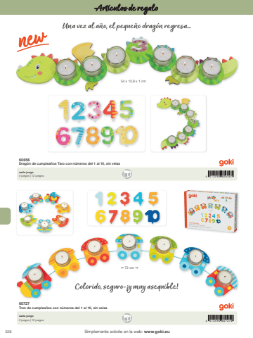 3284 013594 6072784 013594 606561%u00ef 72 cm %u00f054 x 12,9 x 1 cmSimplemente solicite en la web: www.goki.euArt%u00edculos de regalo60727Tren de cumplea%u00f1os con n%u00fameros del 1 al 10, sin velas60656Drag%u00f3n de cumplea%u00f1os Taro con n%u00fameros del 1 al 10, sin velascada juego0 juegos | 12 juegoscada juego0 juegos | 12 juegosUna vez al a%u00f1o, el peque%u00f1o drag%u00f3n regresa...Colorido, seguro-%u00a1y muy asequible!