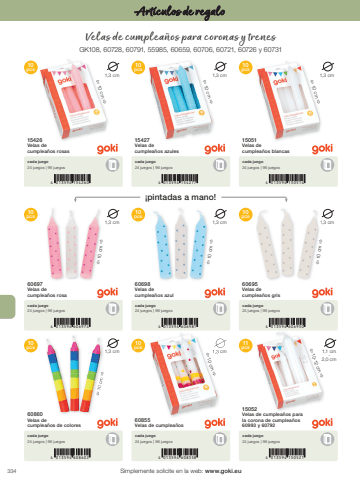 3344 013594 1542604 013594 6069744 013594 6086024 013594 1542774 013594 6069814 013594 6085584 013594 1505144 013594 6069504 013594 150521%u00ef10 cm %u00f0%u00ef10 cm %u00f0%u00ef10 cm %u00f01,3 cm1,3 cm1,3 cm1,3 cm1,3 cm1,3 cm1,3 cm1,3 cm10pcs10pcs10pcs10pcs10pcs10pcs10pcs10pcs11pcs1,3 cm%u00ef10 cm %u00f0%u00ef10 cm %u00f0%u00ef10 cm %u00f0%u00ef10 cm %u00f010 cm %u00f0%u00ef%u00ef1,3 cm10 cm %u00f0%u00ef10-12 cm %u00f01,1 cm- 2,0 cmSimplemente solicite en la web: www.goki.euArt%u00edculos de regalo15426Velas decumplea%u00f1os rosas60697Velas de cumplea%u00f1os rosa60860Velas de cumplea%u00f1os de colores15427Velas de cumplea%u00f1os azules60698Velas decumplea%u00f1os azul60855Velas de cumplea%u00f1os15051Velas de cumplea%u00f1os blancas60695Velas de cumplea%u00f1os gris15052Velas de cumplea%u00f1os para la corona de cumplea%u00f1os60993 y 60792cada juego24 juegos | 96 juegoscada juego24 juegos | 96 juegoscada juego24 juegos | 96 juegoscada juego24 juegos | 96 juegoscada juego24 juegos | 96 juegoscada juego24 juegos | 96 juegoscada juego24 juegos | 96 juegoscada juego24 juegos | 96 juegoscada juego24 juegos | 96 juegosVelas de cumplea%u00f1os para coronas y trenesGK108, 60728, 60791, 55985, 60659, 60706, 60721, 60726 y 60731%u00a1pintadas a mano!
