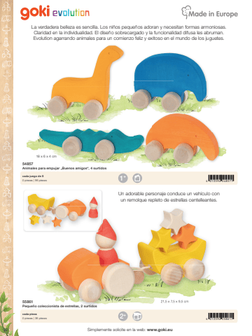 32evolution18 x 6 x 4 cm21,5 x 7,5 x 9,5 cm1 4 013594 548571+2 4 013594 558617+Simplemente solicite en la web: www.goki.eu54857Animales para empujar %u201eBuenos amigos%u201c, 4 surtidoscada juego de 80 piezas | 96 piezas55861Peque%u00f1o coleccionista de estrellas, 2 surtidoscada pieza0 piezas | 36 piezasUn adorable personaje conduce un veh%u00edculo con un remolque repleto de estrellas centelleantes. La verdadera belleza es sencilla. Los ni%u00f1os peque%u00f1os adoran y necesitan formas armoniosas.Claridad en la individualidad. El dise%u00f1o sobrecargado y la funcionalidad difusa les abruman. Evolution agarrando animales para un comienzo feliz y exitoso en el mundo de los juguetes.