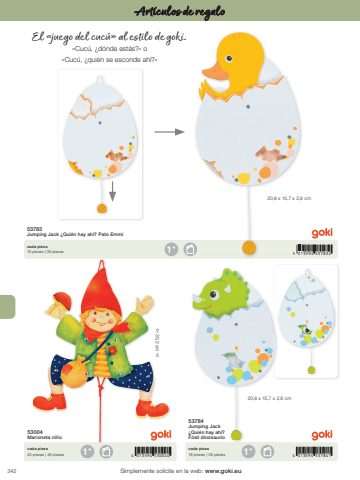 3421+ 1+4 013594 530040 4 013594 5378411 4 013594 537834+420,8 x 15,7 x 2,8 cm20,8 x 15,7 x 2,8 cm%u00ef 30,2 cm %u00f0Simplemente solicite en la web: www.goki.euArt%u00edculos de regalo53004Marioneta ni%u00f1o53784Jumping Jack %u00bfQui%u00e9n hay ah%u00ed? F%u00f3sil dinosauriocada pieza24 piezas | 48 piezascada pieza18 piezas | 36 piezas53783Jumping Jack %u00bfQui%u00e9n hay ah%u00ed? Pato Emmicada pieza18 piezas | 36 piezasEl %u00abjuego del cuc%u00fa%u00bb al estilo de goki.%u00abCuc%u00fa, %u00bfd%u00f3nde est%u00e1s?%u00bb o %u00abCuc%u00fa, %u00bfqui%u00e9n se esconde ah%u00ed?%u00bb
