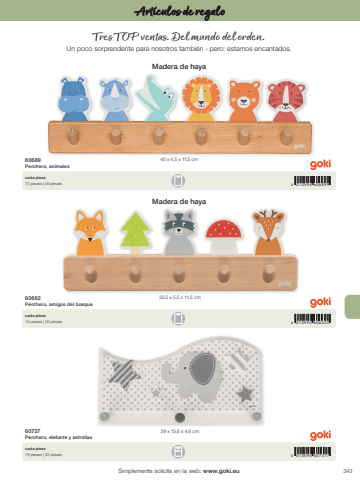 3434 013594 6073774 013594 6066224 013594 60689940 x 4,5 x 11,5 cm32,5 x 5,5 x 11,5 cm29 x 15,6 x 4,6 cmSimplemente solicite en la web: www.goki.euArt%u00edculos de regalo60737Perchero, elefante y estrellas60662Perchero, amigos del bosque60689Perchero, animalescada pieza16 piezas | 32 piezascada pieza10 piezas | 20 piezascada pieza10 piezas | 20 piezasMadera de hayaMadera de hayaTres TOP ventas. Del mundo del orden.Un poco sorprendente para nosotros tambi%u00e9n - pero: estamos encantados.