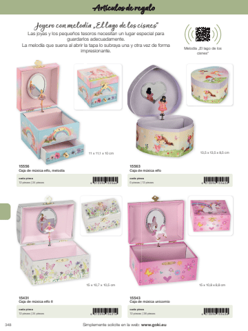 3484 013594 1543144 013594 1555644 013594 1554344 013594 15563211 x 11,1 x 10 cm 13,5 x 13,5 x 8,5 cm15 x 10,7 x 10,5 cm 15 x 10,8 x 8,8 cmSimplemente solicite en la web: www.goki.euArt%u00edculos de regalo15431Caja de m%u00fasica elfo II15556Caja de m%u00fasica elfo, melod%u00eda15543Caja de m%u00fasica unicornio15563Caja de m%u00fasica elfocada pieza12 piezas | 24 piezascada pieza12 piezas | 24 piezascada pieza12 piezas | 36 piezascada pieza0 piezas | 12 piezas Joyero con melod%u00eda %u201eEl lago de los cisnes%u201c Las joyas y los peque%u00f1os tesoros necesitan un lugar especial para guardarlos adecuadamente.La melod%u00eda que suena al abrir la tapa lo subraya una y otra vez de forma impresionante. Melod%u00eda %u201eEl lago de los cisnes%u201c