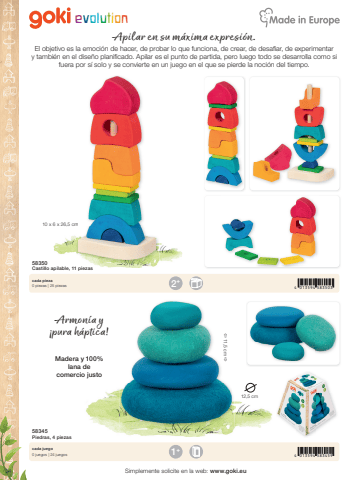 34evolution10 x 6 x 26,5 cm%u00ef 11,5 cm %u00f012,5 cm1 4 013594 583459+2 4 013594 583503+Simplemente solicite en la web: www.goki.eu58345Piedras, 4 piezascada juego0 juegos | 24 juegos58350Castillo apilable, 11 piezascada pieza0 piezas | 25 piezasMadera y 100% lana de comercio justoApilar en su m%u00e1xima expresi%u00f3n.El objetivo es la emoci%u00f3n de hacer, de probar lo que funciona, de crear, de desafi ar, de experimentar y tambi%u00e9n en el dise%u00f1o planifi cado. Apilar es el punto de partida, pero luego todo se desarrolla como si fuera por s%u00ed solo y se convierte en un juego en el que se pierde la noci%u00f3n del tiempo.Armon%u00eda y%u00a1pura h%u00e1ptica!