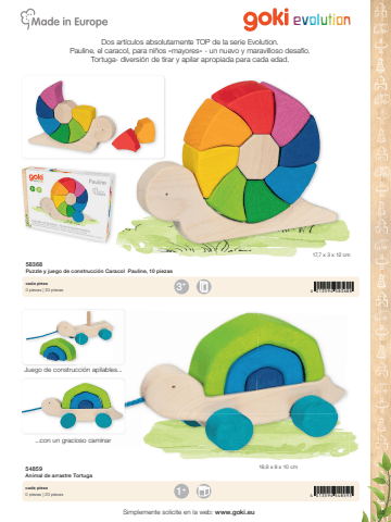 35evolution3 4 013594 583688+1 4 013594 548595+17,7 x 3 x 12 cm18,9 x 8 x 10 cmSimplemente solicite en la web: www.goki.eu58368Puzzle y juego de construcci%u00f3n Caracol Pauline, 10 piezascada pieza0 piezas | 30 piezas54859Animal de arrastre Tortugacada pieza0 piezas | 20 piezas...con un gracioso caminarJuego de construcci%u00f3n apilables...Dos art%u00edculos absolutamente TOP de la serie Evolution. Pauline, el caracol, para ni%u00f1os %u00abmayores%u00bb - un nuevo y maravilloso desaf%u00edo. Tortuga- diversi%u00f3n de tirar y apilar apropiada para cada edad.