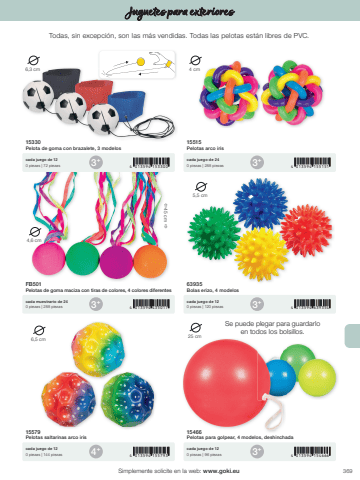 3693+3+4+3+3+3+4 013594 1533004 013594 4350174 013594 1557934 013594 1551514 013594 6393544 013594 1546666,3 cm 4 cm4,6 cm%u00ef 45 cm %u00f05,5 cm6,5 cm 25 cmSimplemente solicite en la web: www.goki.euJuguetes para exteriores15330Pelota de goma con brazalete, 3 modelosFB501Pelotas de goma maciza con tiras de colores, 4 colores diferentes15579Pelotas saltarinas arco iris15515Pelotas arco iris63935Bolas erizo, 4 modelos15466Pelotas para golpear, 4 modelos, deshinchadacada juego de 120 piezas | 72 piezascada muestrario de 240 piezas | 288 piezascada juego de 120 piezas | 144 piezascada juego de 240 piezas | 288 piezascada juego de 120 piezas | 120 piezascada juego de 120 piezas | 96 piezasTodas, sin excepci%u00f3n, son las m%u00e1s vendidas. Todas las pelotas est%u00e1n libres de PVC.Se puede plegar para guardarlo en todos los bolsillos.