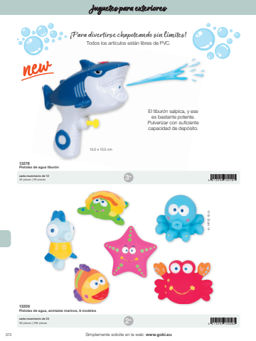 3724 013594 1327874 013594 1320603+2+%u00ef 6 - 9 cm %u00f013,5 x 12,5 cmSimplemente solicite en la web: www.goki.euJuguetes para exteriores13278Pistolas de agua tibur%u00f3n13206Pistolas de agua, animales marinos, 6 modeloscada muestrario de 1248 piezas | 96 piezascada muestrario de 2496 piezas | 288 piezas%u00a1Para divertirse chapoteando sin l%u00edmites! Todos los art%u00edculos est%u00e1n libres de PVC.El tibur%u00f3n salpica, y esees bastante potente.Pulverizar con suficientecapacidad de dep%u00f3sito.
