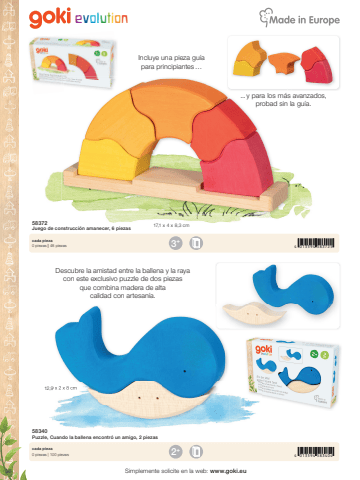 36evolution17,1 x 4 x 8,3 cm12,9 x 2 x 8 cm4 013594 5834044 013594 5837252+3+Simplemente solicite en la web: www.goki.eu58340Puzzle, Cuando la ballena encontr%u00f3 un amigo, 2 piezas58372Juego de construcci%u00f3n amanecer, 6 piezascada pieza0 piezas | 100 piezascada pieza0 piezas | 48 piezasIncluye una pieza gu%u00eda para principiantes %u2026... y para los m%u00e1s avanzados, probad sin la gu%u00eda. Descubre la amistad entre la ballena y la raya con este exclusivo puzzle de dos piezasque combina madera de alta calidad con artesan%u00eda.