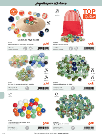 3783+ 3+3+3+3+3+4 013594 639477 4 013594 6392484 013594 6392794 013594 6386304 013594 6392624 013594 06150612 cm1,6 cm,3,5 cm1,6 cm20 x1,6 cm86 x2,5 cm1 x2,5 cm2 x1,6 cm 1,6 cmSimplemente solicite en la web: www.goki.euJuguetes para exteriores63947Juego de canicas con plato, 31 canicas63924Mi saco de 50 canicas63927Red con 21 canicas de vidrio, 3 modelos63863Canicas de vidrio de colores lisos, 6 colores surtidos63926Red con 88 canicas de vidrioGM150Ojo de gato, 50 canicascada bolsa6 bolsas | 36 bolsascada bolsa6 bolsas | 24 bolsascada juego de 120 juegos | 96 juegoscada juego de 60 juegos | 18 juegoscada juego de 60 juegos | 24 juegoscada bolsa de 5025 bolsas | 50 bolsasMadera de haya maciza