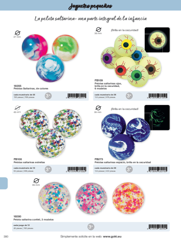 3803 4 013594 160902+4 013594 4310644 013594 1605514 013594 4327334 013594 4310953+3+3+3+27 mm35 mm43 mm 35 mm45 mmSimplemente solicite en la web: www.goki.euJuguetes peque%u00f1os16090Pelota saltarina confeti, 3 modeloscada juego de 1248 piezas | 192 piezasFB106Pelotas saltarinas estrellas16055Pelotas Saltarinas, de coloresFB273Pelotas saltarinas espacio, brilla en la oscuridadFB109Pelotas saltarinas ojos, brilla en la oscuridad, 6 modeloscada muestrario de 1664 piezas | 256 piezascada muestrario de 48192 piezas | 768 piezascada muestrario de 36144 piezas | 432 piezascada muestrario de 36144 piezas | 576 piezasLa pelota saltarina- una parte integral de la infancia%u00a1Brilla en la oscuridad!%u00a1Brilla en la oscuridad!