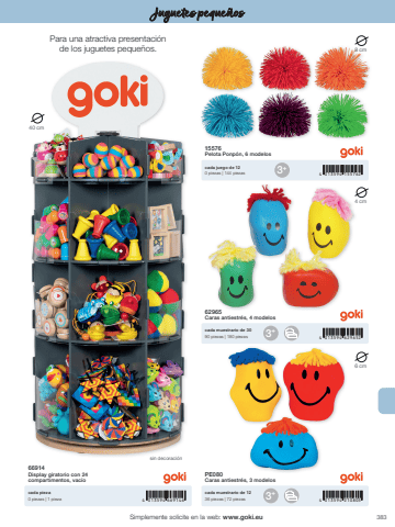 3834 013594 669146 4 013594 2108054 013594 6296524 013594 1557623+3+3+40 cm4 cm8 cm6 cmSimplemente solicite en la web: www.goki.euJuguetes peque%u00f1os66914Display giratorio con 24 compartimentos, vac%u00edocada pieza0 piezas | 1 piezaPE080Caras antiestr%u00e9s, 3 modelos62965Caras antiestr%u00e9s, 4 modelos15576Pelota Ponp%u00f3n, 6 modeloscada muestrario de 1236 piezas | 72 piezascada muestrario de 3090 piezas | 180 piezascada juego de 120 piezas | 144 piezassin decoraci%u00f3nPara una atractiva presentaci%u00f3nde los juguetes peque%u00f1os.
