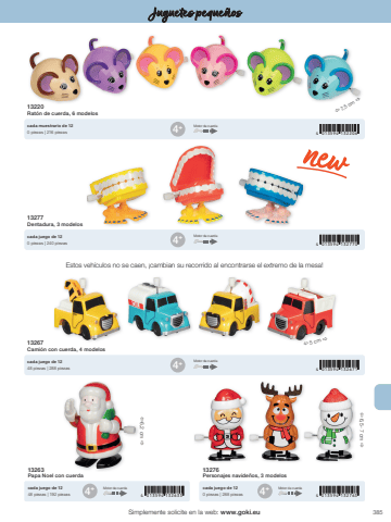 3854 4 013594 132633 4 013594 132763+ 4+4 013594 1322064 013594 1327704 013594 1326714+4+4+%u00ef 7,5 cm %u00f0%u00ef 6,2 cm %u00f0%u00ef 6,5 - 7 cm %u00f0%u00ef 5 cm %u00f0Simplemente solicite en la web: www.goki.euJuguetes peque%u00f1os13263Papa Noel con cuerda13276Personajes navide%u00f1os, 3 modeloscada juego de 1248 piezas | 192 piezascada juego de 120 piezas | 288 piezas13220Rat%u00f3n de cuerda, 6 modelos13277Dentadura, 3 modelos13267Cami%u00f3n con cuerda, 4 modeloscada muestrario de 120 piezas | 216 piezascada juego de 120 piezas | 240 piezascada juego de 1248 piezas | 288 piezasMotor de cuerda Motor de cuerdaMotor de cuerdaMotor de cuerdaMotor de cuerdaEstos veh%u00edculos no se caen, %u00a1cambian su recorrido al encontrarse el extremo de la mesa!