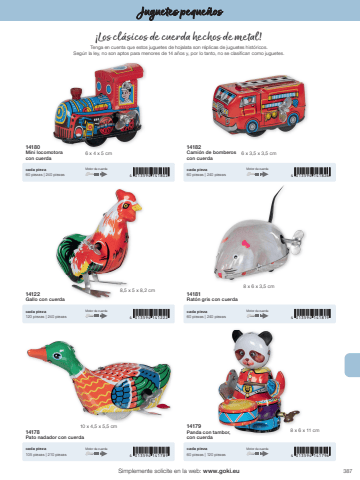 3874 013594 1417894 013594 1412224 013594 1418024 013594 1417964 013594 1418194 013594 1418266 x 4 x 5 cm8,5 x 5 x 8,2 cm10 x 4,5 x 5,5 cm6 x 3,5 x 3,5 cm8 x 6 x 3,5 cm8 x 6 x 11 cmSimplemente solicite en la web: www.goki.euJuguetes peque%u00f1os14178Pato nadador con cuerda14122Gallo con cuerda14180Mini locomotora con cuerda14179Panda con tambor, con cuerda14181Rat%u00f3n gris con cuerda14182Cami%u00f3n de bomberos con cuerdacada pieza105 piezas | 210 piezascada pieza120 piezas | 240 piezascada pieza60 piezas | 240 piezascada pieza60 piezas | 120 piezascada pieza60 piezas | 240 piezascada pieza60 piezas | 240 piezas%u00a1Los cl%u00e1sicos de cuerda hechos de metal!Tenga en cuenta que estos juguetes de hojalata son r%u00e9plicas de juguetes hist%u00f3ricos.Seg%u00fan la ley, no son aptos para menores de 14 a%u00f1os y, por lo tanto, no se clasifican como juguetes.Motor de cuerdaMotor de cuerdaMotor de cuerdaMotor de cuerdaMotor de cuerdaMotor de cuerda