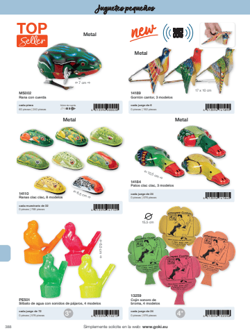 3884 013594 200028 4 013594 1418954 013594 1411094 013594 1418404 013594 215015 4 013594 132596%u00ef 7 cm %u00f0%u00ef 6,5 cm %u00f0%u00ef 10,5 cm %u00f0%u00ef 6,5 cm %u00f015,5 cm3+ 4+17 x 10 cmSimplemente solicite en la web: www.goki.euJuguetes peque%u00f1osMS002Rana con cuerda14189Gorri%u00f3n cantor, 3 modeloscada pieza60 piezas | 240 piezascada juego de 60 piezas | 162 piezas14110Ranas clac clac, 8 modelos14184Patos clac clac, 3 modelos13259Cojin sonoro de broma, 4 modelosPE501Silbato de agua con sonidos de p%u00e1jaros, 4 modeloscada muestrario de 320 piezas | 768 piezascada juego de 240 piezas | 576 piezascada juego de 240 piezas | 576 piezascada juego de 720 piezas | 576 piezasMotor de cuerdaMetalMetalMetalMetal