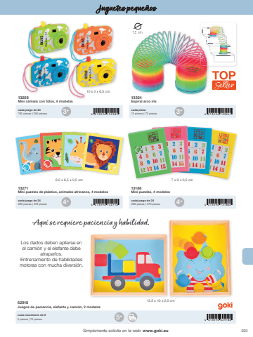 3933+4+ 4+3+4 013594 1325894 013594 132718 4 013594 1318654 013594 1332415 4 013594 629188+7,5 cm10 x 3 x 6,5 cm6,5 x 6,5 x 0,5 cm 7 x 9 x 0,5 cm12,5 x 10 x 2,5 cmSimplemente solicite en la web: www.goki.euJuguetes peque%u00f1os13258Mini c%u00e1mara con fotos, 4 modelos13271Mini puzzles de pl%u00e1stico, animales africanos, 4 modelos13186Mini puzzles, 4 modelos13324Espiral arco iris cada juego de 24192 piezas | 384 piezascada juego de 24288 piezas | 576 piezascada juego de 24288 piezas | 576 piezascada pieza12 piezas | 72 piezas62918Juegos de paciencia, elefante y cami%u00f3n, 2 modeloscada muestrario de 60 piezas | 72 piezasAqu%u00ed se requiere paciencia y habilidad.Los dados deben apilarse en el cami%u00f3n y el elefante debe atraparlos.Entrenamiento de habilidades motoras con mucha diversi%u00f3n.