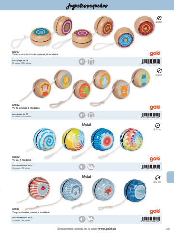 3974 013594 6296764 013594 6289454 013594 6288224 013594 6289144+4+4+4+4,8 cm4,8 cm5,5 cm5,5 cmSimplemente solicite en la web: www.goki.euJuguetes peque%u00f1os62967Yo-Yo con c%u00edrculos de colores, 6 modelos62894Yo-Yo animal, 6 modelos62882Yo-yo, 4 modelos62891Yo-yo animales, metal, 4 modeloscada juego de 1296 piezas | 384 piezascada juego de 1296 piezas | 384 piezascada muestrario de 1248 piezas | 96 piezascada muestrario de 1248 piezas | 96 piezasMetalMetal