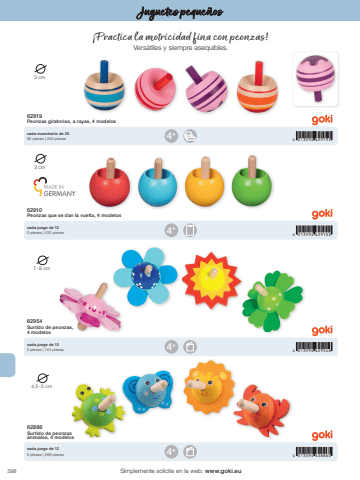 3984 013594 6291954 013594 6291024 013594 6295464 013594 6288604+4+4+4+3 cm4,5 - 5 cm3 cm7 - 8 cmSimplemente solicite en la web: www.goki.euJuguetes peque%u00f1os62919Peonzas giratorias, a rayas, 4 modelos62910Peonzas que se dan la vuelta, 4 modelos62954Surtido de peonzas, 4 modelos62886Surtido de peonzas animales, 4 modeloscada muestrario de 2080 piezas | 240 piezascada juego de 120 piezas | 432 piezascada juego de 120 piezas | 144 piezascada juego de 120 piezas | 288 piezas%u00a1Practica la motricidad fina con peonzas!Vers%u00e1tiles y siempre asequibles.