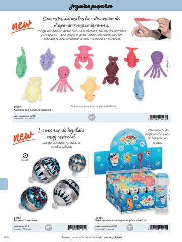 4005 4 013594 132800+6 4 013594 141871 4 013594 154512+ 3+%u00ef 11 cm %u00f05,5 cm%u00ef 8 - 9 cm %u00f0Simplemente solicite en la web: www.goki.euJuguetes peque%u00f1os13280Animales con honda, 8 modeloscada muestrario de 24288 piezas | 864 piezas14187Peonzas, 3 modelos15451Bote para hacer burbujas de jab%u00f3n de 60 mlcada juego de 60 piezas | 72 piezascada muestrario de 360 piezas | 144 piezasCon estos animales la %u00abdiversi%u00f3n de disparar%u00bb nunca termina.Ponga el dedo en la secci%u00f3n de la cabeza, tire de los animales y %u00abdispare%u00bb. Cada golpe cuenta. %u00a1Absolutamente seguro! Tambi%u00e9n puede amenizar la vida cotidiana en la oficina.Colores ordenados por disponibilidad.La peonza de hojalata muy especialLarga duraci%u00f3n gracias a su alta calidadBote de burbujas de jab%u00f3n con juego de habilidad en la tapa.