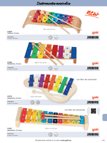 4034 013594 6190734 013594 6197904 013594 6195924 013594 6183973+3+3+3+3+28 x 11,5 x 5,2 cm26,5 x 13 x 3,5 cm31,5 x 16 x 3 cm37,5 x 11 x 4,5 cmSimplemente solicite en la web: www.goki.euInstrumentos musicales61907Metal%u00f3fono, 12 tonos61979Metal%u00f3fono, 8 tonos 61959Metal%u00f3fono, 8 tonos 61839Xil%u00f3fono, 8 tonoscada pieza8 piezas | 16 piezascada pieza6 piezas | 24 piezascada pieza6 piezas | 24 piezascada pieza0 piezas | 30 piezascon libro de cancionescon libro de canciones