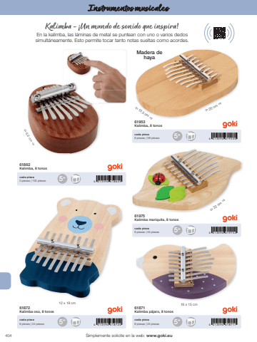 4045+5+5+5+ 5+4 013594 6195304 013594 6197524 013594 6186254 013594 618724 4 013594 618717%u00ef 6,8 cm %u00f012 x 19 cm%u00ef 20 cm %u00f0%u00ef 13,5 cm %u00f0%u00ef 22 cm %u00f018 x 15 cmSimplemente solicite en la web: www.goki.euInstrumentos musicales61953Kalimba, 8 tonos61975Kalimba mariquita, 8 tonos61862Kalimba, 8 tonos61871Kalimba p%u00e1jaro, 8 tonos61872Kalimba oso, 8 tonoscada pieza6 piezas | 36 piezascada pieza6 piezas | 24 piezascada pieza0 piezas | 100 piezascada pieza6 piezas | 24 piezascada pieza6 piezas | 24 piezasKalimba - %u00a1Un mundo de sonido que inspira!En la kalimba, las l%u00e1minas de metal se puntean con uno o varios dedos simult%u00e1neamente. Esto permite tocar tanto notas sueltas como acordes.Madera de haya