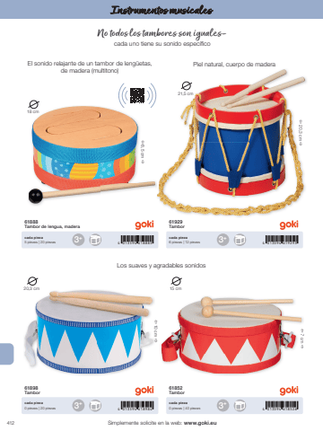 4123+3+3+3+4 013594 6189844 013594 6188854 013594 6185264 013594 619295%u00ef 10 cm %u00f0%u00ef 7 cm %u00f020,3 cm 15 cm%u00ef 7 cm %u00f0%u00ef 8,5 cm %u00f018 cm21,5 cm%u00ef 20,3 cm %u00f0Simplemente solicite en la web: www.goki.euInstrumentos musicales61898Tambor61888Tambor de lengua, madera61852Tambor61929Tamborcada pieza0 piezas | 20 piezascada pieza5 piezas | 20 piezascada pieza0 piezas | 40 piezascada pieza6 piezas | 12 piezasNo todos los tambores son igualescada uno tiene su sonido espec%u00edficoLos suaves y agradables sonidos El sonido relajante de un tambor de leng%u00fcetas, de madera (multitono)Piel natural, cuerpo de madera