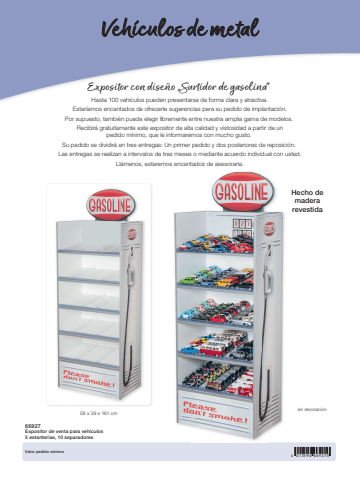 4 013594 66927658 x 38 x 161 cm66927Expositor de venta para veh%u00edculos5 estanter%u00edas, 10 separadoresValor pedido m%u00ednimoVeh%u00edculos de metalExpositor con dise%u00f1o %u201eSurtidor de gasolina%u201c Hasta 100 veh%u00edculos pueden presentarse de forma clara y atractiva. Estar%u00edamos encantados de ofrecerle sugerencias para su pedido de implantaci%u00f3n. Por supuesto, tambi%u00e9n puede elegir libremente entre nuestra amplia gama de modelos. Recibir%u00e1 gratuitamente este expositor de alta calidad y vistosidad a partir de un pedido m%u00ednimo, que le informaremos con mucho gusto. Su pedido se dividir%u00e1 en tres entregas: Un primer pedido y dos posteriores de reposici%u00f3n. Las entregas se realizan a intervalos de tres meses o mediante acuerdo individual con usted. Ll%u00e1menos, estaremos encantados de asesorarle. Hecho de madera revestidasin decoraci%u00f3n