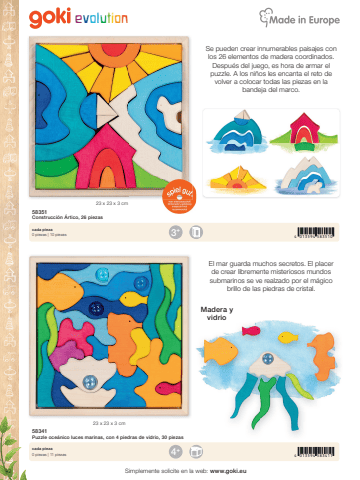 42evolution23 x 23 x 3 cm23 x 23 x 3 cm4 013594 5835104 013594 5834113+4+Simplemente solicite en la web: www.goki.eu58351Construcci%u00f3n %u00c1rtico, 26 piezas58341Puzzle oce%u00e1nico luces marinas, con 4 piedras de vidrio, 30 piezascada pieza0 piezas | 10 piezascada pieza0 piezas | 11 piezasMadera y vidrioSe pueden crear innumerables paisajes con los 26 elementos de madera coordinados. Despu%u00e9s del juego, es hora de armar el puzzle. A los ni%u00f1os les encanta el reto de volver a colocar todas las piezas en la bandeja del marco.El mar guarda muchos secretos. El placer de crear libremente misteriosos mundos submarinos se ve realzado por el m%u00e1gico brillo de las piedras de cristal.