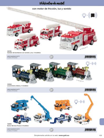 4394 013594 1211564 013594 1210404 013594 1231503+3+3+%u00ef 17,5 cm %u00f0%u00ef 15 cm %u00f0%u00ef 13 cm %u00f0Simplemente solicite en la web: www.goki.euVeh%u00edculos de metal12115Cami%u00f3n de bomberos con sonido y luz, 4 modelos12104Locomotora cl%u00e1sica, 4 modelos12315Sonic-Service-Truck, 6 modeloscada muestrario de 120 piezas | 60 piezascada muestrario de 120 piezas | 60 piezascada muestrario de 120 piezas | 72 piezascon motor de fricci%u00f3n, luz y sonido