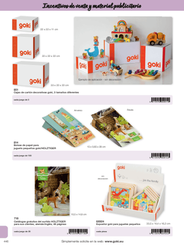 4464 013594 007184 4 013594 6692454 013594 0085184 013594 00814322 x 22 x 22 cm22 x 22 x 11 cm33 x 22 x 22 cm15 x 0,65 x 28 cmHandgearbeitet Handcrafted 10,5 x 14,8 cm33,5 x 14,4 x 16,2 cmSimplemente solicite en la web: www.goki.euIncentivos de venta y material publicitario718Cat%u00e1logos gratuitos del surtido HOLZTIGER para sus clientes, alem%u00e1n/ingl%u00e9s, 48 p%u00e1ginas66924Expositor goki para juguetes peque%u00f1oscada juego de 20 cada pieza851Cajas de cart%u00f3n decorativas goki, 3 tama%u00f1os diferentes814Bolsas de papel parajuguets peque%u00f1os goki/HOLZTIGERcada juego de 3cada juego de 100Ejemplo de aplicaci%u00f3n - sin decoraci%u00f3nAnverso Rev%u00e9ssindecoraci%u00f3n