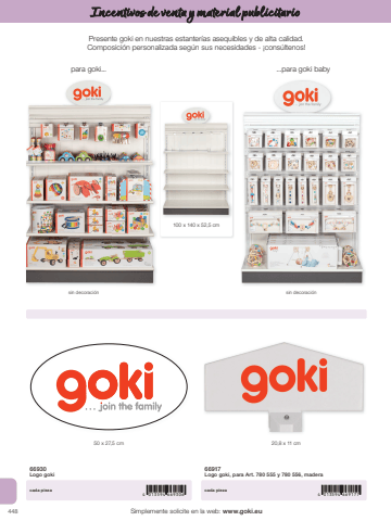 4484 013594 669306 4 013594 669177100 x 140 x 52,5 cm50 x 27,5 cm 20,8 x 11 cmSimplemente solicite en la web: www.goki.euIncentivos de venta y material publicitario66917Logo goki, para Art. 780 555 y 780 556, madera66930Logo gokicada pieza cada piezaPresente goki en nuestras estanter%u00edas asequibles y de alta calidad.Composici%u00f3n personalizada seg%u00fan sus necesidades - %u00a1cons%u00faltenos!para goki... ...para goki babysin decoraci%u00f3n sin decoraci%u00f3n