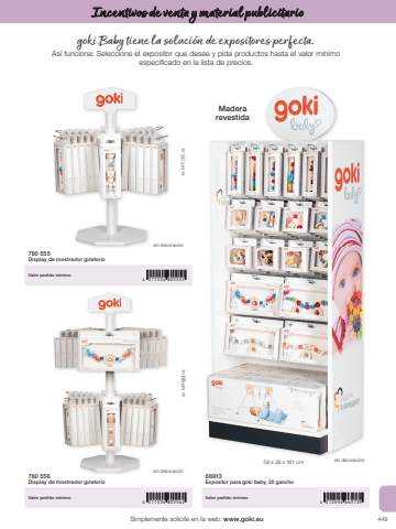 4494 011534 805562 4 013594 6691394 011534 805555%u00ef 86 cm %u00f0%u00ef 50 cm %u00f058 x 38 x 161 cmSimplemente solicite en la web: www.goki.euIncentivos de venta y material publicitario780 556Display de mostrador giratorio66913Expositor para goki baby, 20 gancho780 555Display de mostrador giratorioValor pedido m%u00ednimo Valor pedido m%u00ednimoValor pedido m%u00ednimogoki Baby tiene la soluci%u00f3n de expositores perfecta. As%u00ed funciona: Seleccione el expositor que desee y pida productos hasta el valor m%u00ednimo especificado en la lista de precios.sin decoraci%u00f3nsin decoraci%u00f3nsin decoraci%u00f3nMadera revestida
