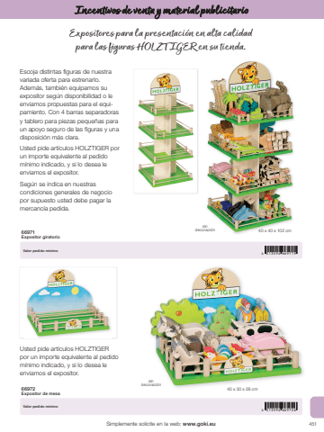 4514 013594 6697264 013594 66971940 x 40 x 102 cm40 x 30 x 28 cmSimplemente solicite en la web: www.goki.euIncentivos de venta y material publicitario66972Expositor de mesa66971Expositor giratorioValor pedido m%u00ednimoValor pedido m%u00ednimoEscoja distintas figuras de nuestra variada oferta para estrenarlo. Adem%u00e1s, tambi%u00e9n equipamos su expositor seg%u00fan disponibilidad o le enviamos propuestas para el equipamiento. Con 4%u00a0barras separadoras y tablero para piezas peque%u00f1as para un apoyo seguro de las figuras y una disposici%u00f3n m%u00e1s clara.Usted pide art%u00edculos HOLZTIGER por un importe equivalente al pedido m%u00ednimo indicado, y si lo desea le enviamos el expositor.Seg%u00fan se indica en nuestras condiciones generales de negocio por supuesto usted debe pagar la mercanc%u00eda pedida.Expositores para la presentaci%u00f3n en alta calidad para las fi guras HOLZTIGER en su tienda.sin decoraci%u00f3nUsted pide art%u00edculos HOLZTIGER por un importe equivalente al pedido m%u00ednimo indicado, y si lo desea leenviamos el expositor.sin decoraci%u00f3n