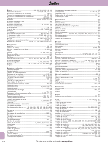 454 Simplemente solicite en la web: www.goki.eu%u00cdndice%u00c1bacos ..................................................266, 267, 315, 316, 318, 319Accesorios de cocina...................................... 132-134, 135, 136-142Accesorios para casas de mu%u00f1ecas ......................................106-113Accesorios para puesto de mercado ............................. 131-137, 138Accesorios para tiendas de comestibles ....................... 131-137, 138Ajedrez..........................................................................224-225, 226Animales ........................................................48-56, 58-62, 323-326Animales chasqueadores.............................................................388Animales oscilantes ..................................................................... 341Animales para empujar ..............................................8, 185-187, 188Animales tambaleantes................................................................ 151Aparcamientos..................................................................... 158, 159Arca de No%u00e9 ............................................................ 30, 70, 262, 326Armarios ......................................................................................343Arm%u00f3nicas............................................................................... 17, 416Art%u00edculos de comercio justo......................................14, 312-313, 445Art%u00edculos para beb%u00e9 ............................................72-96, 122, 123-124Art%u00edculos para pintar.........................................................14, 312-313Aviones ..................................................157, 160, 260, 374, 436-438Ayudas para aprender a caminar......................................90-93, 184Ayudas para la venta................... 22-24, 127, 276, 383, 417, 443-453Backgammon .............................................................................222Balanzas .............................................................................. 132, 138Bancos de trabajo................................................................ 281, 282Bancos y juegos para martillear...................................... 11, 280-282Banjo ...........................................................................................405Barcas ................................................................... 31, 368, 386, 392Barco con globo ..........................................................................368Bastidores de telar....................................................................... 307Batidora ............................................................................... 139, 140Bloques de construcci%u00f3n ........... 38, 39, 40, 295, 296, 297, 298, 299 Bolas de malabares ..................................................................... 370Bolsas de algod%u00f3n .......................................... 14, 135, 312, 313, 445Bolsos....................................... 14, 23, 135, 312, 313, 444, 445, 446Br%u00fajulas........................................................................................364Caballeros medievales.............................................................68, 69Caballitos de palo ........................................................................ 189Caballo balanc%u00edn .......................................................................... 189Cadena de fichas de domin%u00f3 .......................................................298Cadenas de banderines....................................................... 312, 335Cadenas para cochecitos .............................................76-80, 81, 95Cadenas sujetachupetes .................................................... 72-74, 94Cafeteras ............................................................................. 138, 139Caja de caudales met%u00e1lica ...........................................................350Caja m%u00e1gica de dinero .................................................................392Cajas de construcci%u00f3n del castillo..........................................43, 299Cajas de costura.......................................................................... 301Cajas de m%u00fasica ..................................................... 17, 154, 348-349Cajas de regalo.....................................................................355-356Cajas de trucos de magia ...........................................................392Cajas fuertes........................................................................ 350, 351Cajas para colocar, cajas para apilar .........................11, 38, 277-279Cajas registradoras ...................................................................... 131Cajas y cestas de frutas................................................133,-134, 137Cajas y cestas de verduras ...........................................133, 134, 137Cajitas para dientes de leche ...................................................... 351Caleidoscopios .........................................................9, 352-353, 354Calimbas......................................................................................404Camas de mu%u00f1ecas + accesorios ......................................... 114-117Camiones de basura.............................................................166, 173Camiones de bomberos ....... 118, 162, 164, 166, 167, 182, 240, 254, 258, 259, 345, 374, 384, 387, 435, 439Campanas ...................................................................................406Canicas........................................................................................ 378Caravanas de cumplea%u00f1os ................................................. 329, 331Carracas ......................................................................................408Carreteras de juguete............................................................ 155-157Carretilla...............