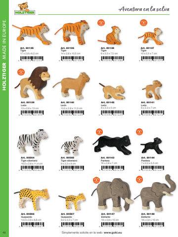 48HOLZTIGER MADE IN EUROPE.4 0 1 3 5 9 4 8 0 1 3554 0 1 3 5 9 4 8 0 1 3 9 34 0 1 3 5 9 4 8056 4 3 4 0 1 3 5 9 4 8 0 1 4 3 04 0 1 3 5 9 4 8 0 147 84 0 1 3 5 9 4 8 0 1 3 6 24 0 1 3 5 9 4 8 0 1 4 0 94 0 1 3 5 9 4 805650 4 0 1 3 5 9 4 8 0 14474 0 1 3 5 9 4 8 0 1 4 8 54 0 1 3 5 9 4 8 0 1 3864 0 1 3 5 9 4 8 0 142 34 0 1 3 5 9 4 80566 74 0 1 3 5 9 4 8 0 1 3 7 94 0 1 3 5 9 4 8 0 141 64 0 1 3 5 9 4 8056 7 4Simplemente solicite en la web: www.goki.euAventura en la selvaArt. 80135 Tigre17 x 2,8 x 8,5 cmArt. 80136Tigre14 x 2,8 x 10,5 cmArt. 80138Tigre6 x 2,3 x 7,5 cmArt. 80137Tigre10 x 2,3 x 7 cmArt. 80139 Le%u00f3n15 x 2,8 x 13 cmArt. 80564 Tigre siberiano16,5 x 2,8 x 11,4 cmArt. 80143Pantera 16 x 2,8 x 7 cmArt. 80144 Pantera7 x 2,3 x 5,5 cmArt. 80566 Guepardo13,5 x 2,8 x 8,8 cmArt. 80567 Guepardo9,3 x 2,3 x 7 cmArt. 80140Le%u00f3n13,5 x 2,8 x 11,5 cmArt. 80565Tigre siberiano9 x 2,3 x 8 cmArt. 80142Le%u00f3n8 x 2,3 x 5 cmArt. 80141 Le%u00f3n6 x 2,3 x 7 cmArt. 80147 Elefante19 x 2,8 x 15 cmArt. 80148 Elefante18 x 2,8 x 16 cm